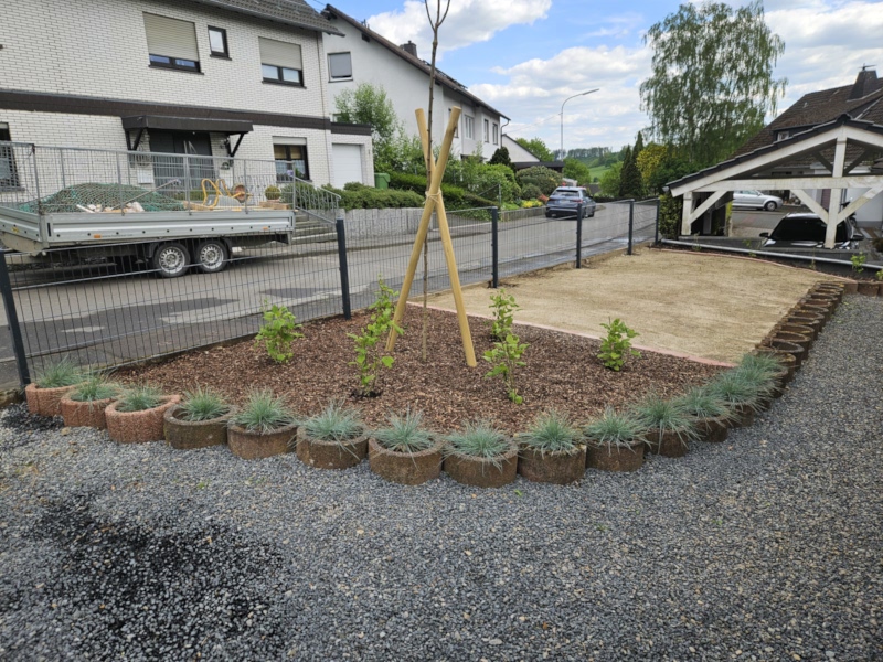 Nach den vorbereitenden Erdarbeiten erfolgte die neue Strukturierung des Vorgartens. Auf Wunsch des Kunden trennten wir die Beet- und Grünflächen durch Pflanzkübel klar vom angrenzenden Gehweg, der mit Kies gestaltet ist. Diese Abgrenzung sorgt nicht nur für eine saubere Optik, sondern erleichtert auch die Pflege der einzelnen Bereiche.